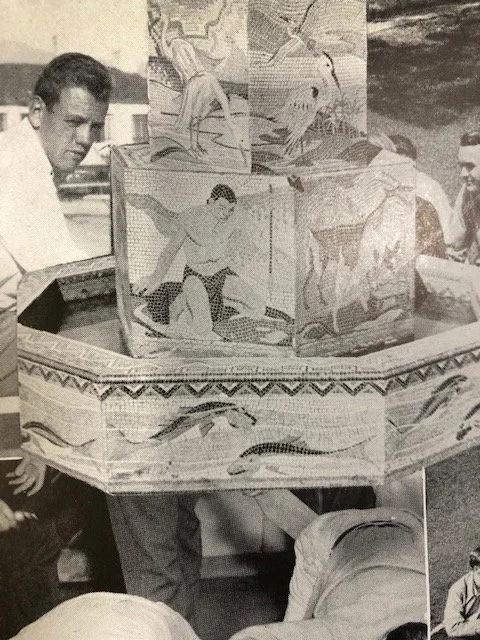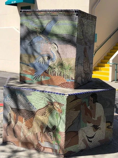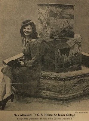 One of the first installations was a mosaic tile fountain. The design, inspired by the Director of College, C.A. Nelson, was built as a memorial to him after his sudden death. According to a Living New Deal website, the fountain, completed in February 1940, was symbolic of life on land, in the sea and in the air and included many examples of animal life. Designed and created as a WPA fine art project, and using 80,000 individual tiles, it was four months in the making. A $400 fund for materials was donated by the classes of ’38 and ’39. The fountain was placed in front of the admin building.